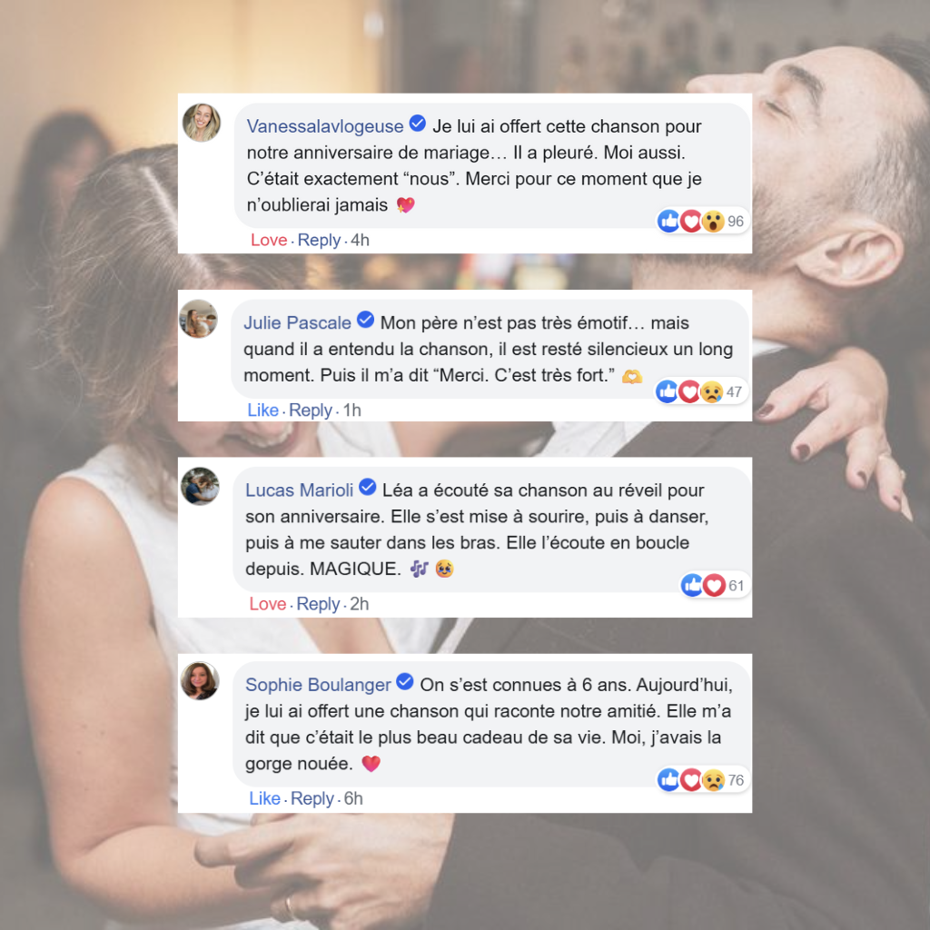 Nos chansons sont créées pour tous ceux à qui vous voulez faire plaisir : votre partenaire, un parent, votre enfant, un(e) ami(e), un collègue… ou même pour vous-même ! Que ce soit pour un anniversaire, une surprise romantique ou un hommage émouvant, nous adaptons le style et le ton à votre histoire.